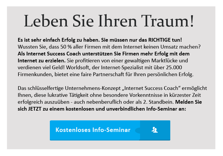 Als Internet Success Coach unterstützen Sie Firmen mehr Erfolg mit dem  Internet zu erzielen. Sie profitieren von einer gewaltigen Marktlücke und verdienen viel Geld! Worldsoft, der Internet-Spezialist mit über 25.000 Firmenkunden, bietet eine faire Partnerschaft für Ihren persönlichen Erfolg.